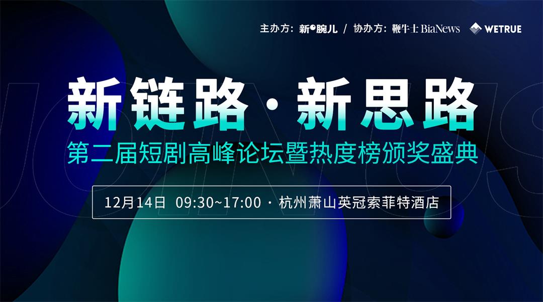 短剧行业高端行业活动再次来袭! 由短剧媒体新腕儿主办,科技媒体鞭牛士和短剧数据平台WETRUE协办的第二届短剧高峰论坛将于12月14日在杭州英冠索菲特酒店举行。 老地方,老朋友,再次相见。