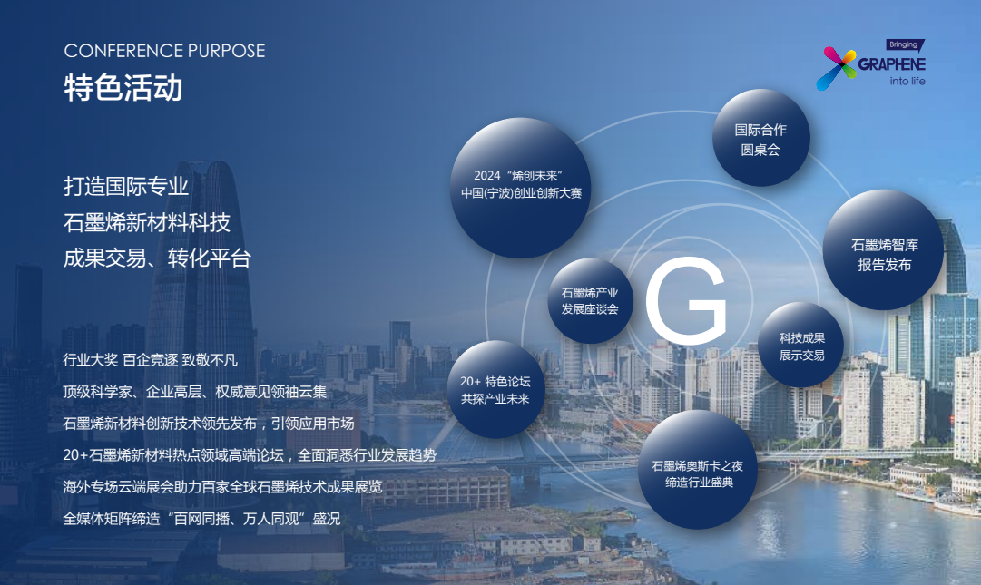 2024 (第十一届)中国国际石墨烯材料应用博览会将于2024年11月1日-3日在宁波湖畔凯悦尚萃酒店举办,展区包括长三角石墨烯产业成就展、全球石墨烯产业服务平台展区以及针对石墨烯原材料展商、石墨烯应用展商、石墨烯设备制造商的特装与标准展区,博览会期间将举行博览会开幕式、新品发布会与推介会等活动,同时,在大会举办期间,大会组委会将组织多方巡展,让参展商能够与目标客户、技术专家、投资方等深入交流,从而帮助参展商解决在企业发展过程中存在的市场、技术和资金问题,进一步帮助石墨烯企业飞速发展。