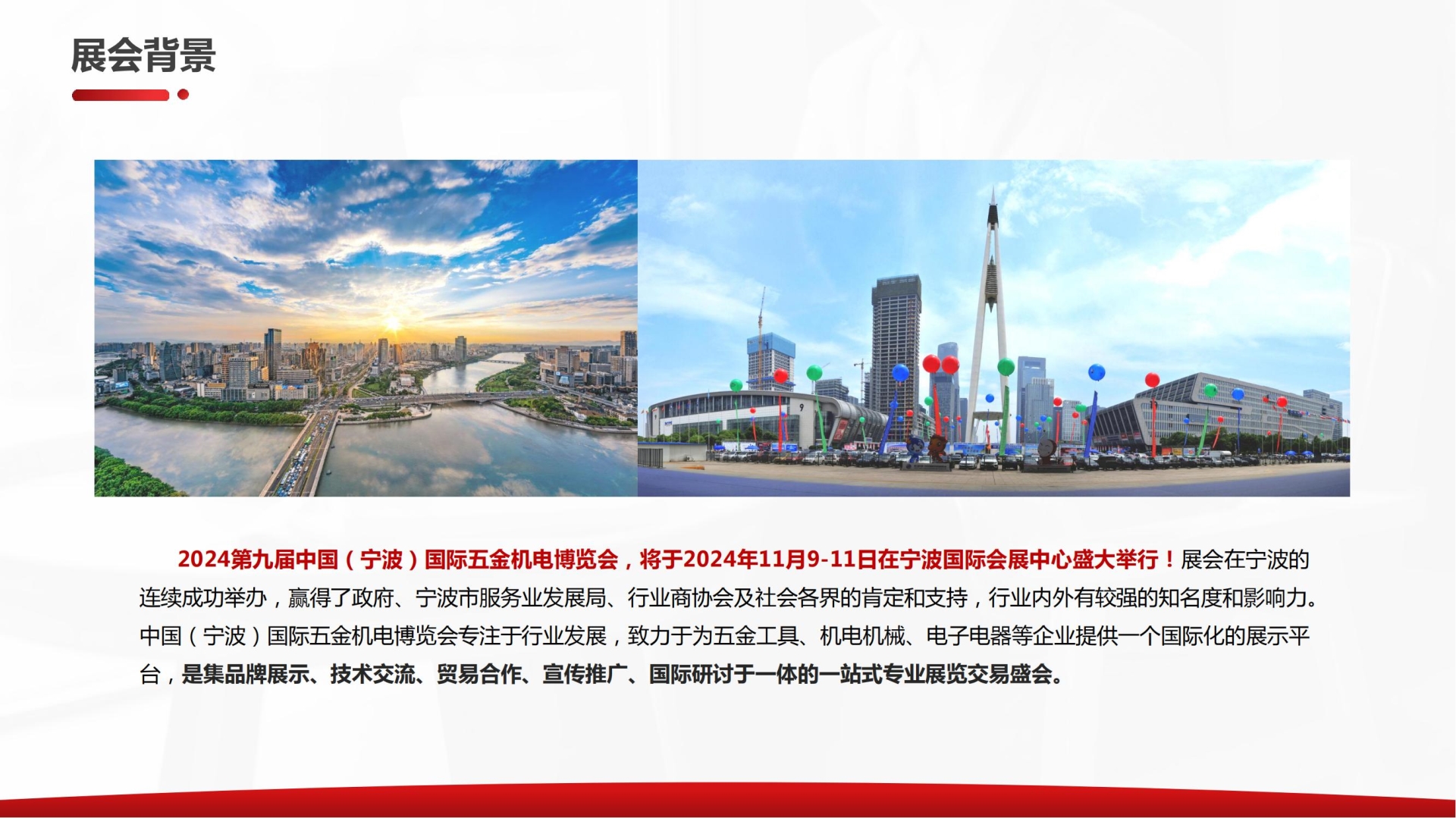 2024第九届中国(宁波)国际五金机电博览会,将于2024年11月9-11日在宁波国际会展中心盛大举办。展会专注于行业发展,致力于为国内外五金工具、机械机电等企业提供一个国际化展示平台,是集品牌展示、技术交流、贸易合作、宣传推广、国际研讨于一体的专业展览交易盛会。