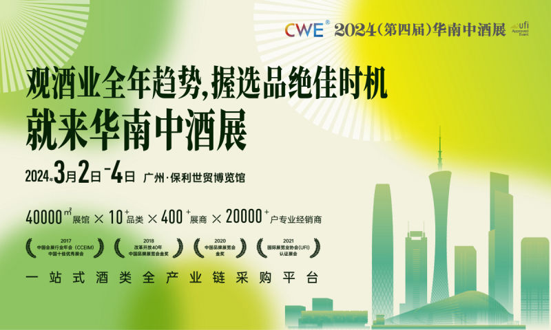 2024年3月2-4日,第四届华南中酒展将在广州•保利世贸博览举办,同期举办第八届全球高端葡萄酒展、第四届中国酒类包装及机械装备展,2大子展全面发力,聚焦细分品类,一同打造一场酒业盛会。 作为开年首展,第四届华南中酒展,规模再突破品质再攀升,40000平米展出面积,10+品类、400+参展企业、上万款产品,将吸引20000+户专业经销商到场参观选品,一场酒业年度盛会将在2024年3月广州春暖花开时等你。