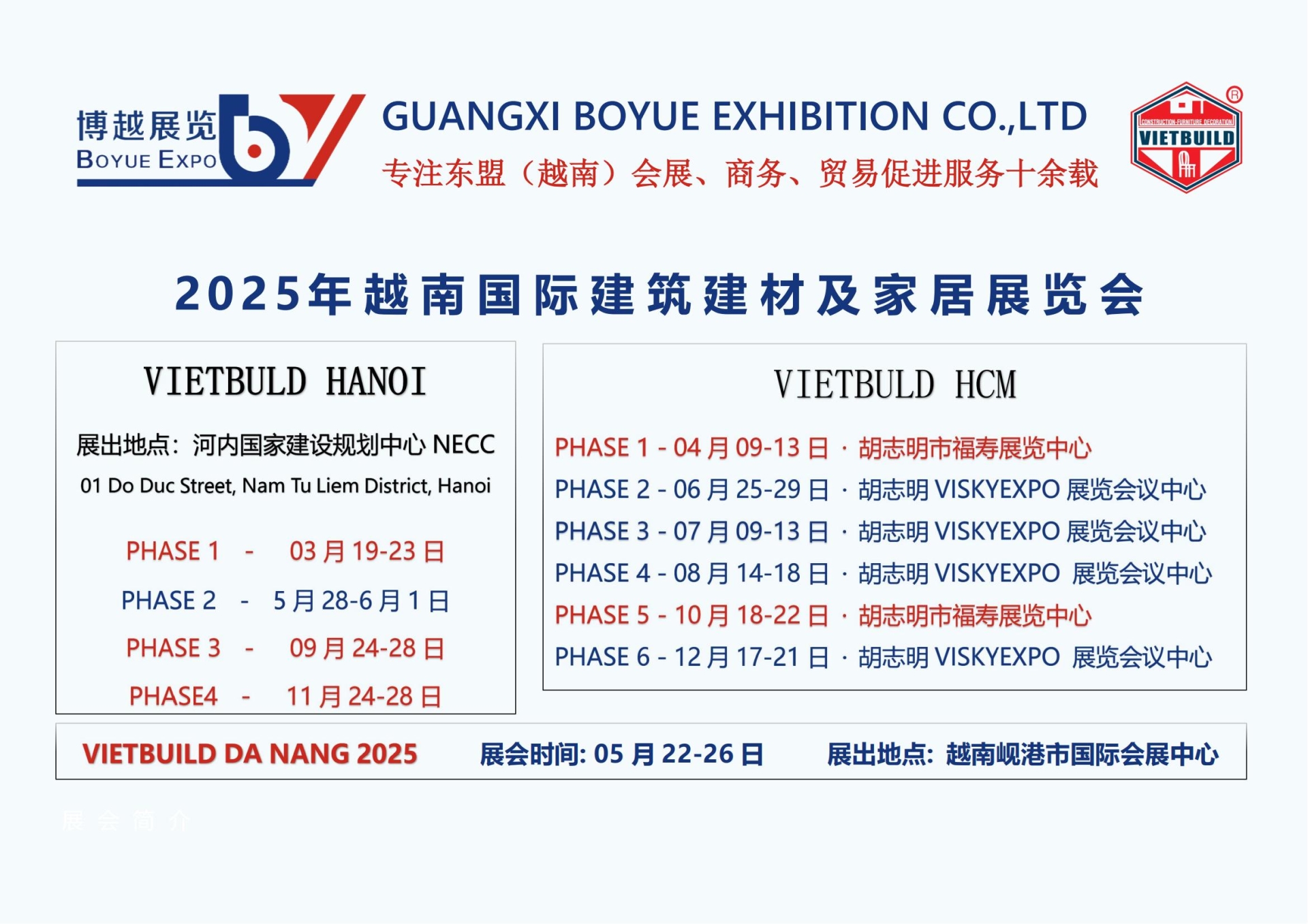 VIETBUILD 越南国际建筑建材及家居装饰展览会创办于 1997年,已发展为涵盖地产、建材、家装、家居、家电、五金、以及相关领域产品技术设备行业名展。每年定期在越南河内市、胡志明市、岘港市、巡回举办 10 余期,总规模近 1.7万个展位。吸引 20 多个国家及地区展商及累计约 45 万人次观众,在越南建筑建材家装领域有广泛、!良好之声誉。