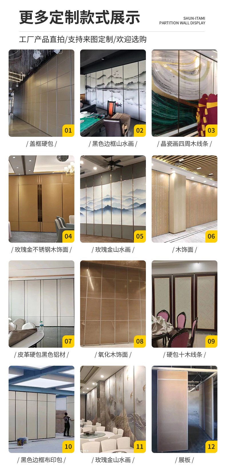图文详情活动隔断主要用于划分空间面积和增加空间,但它不是完全分开的,所以它具有灵活性。这种可变性使空间充满活力,装饰空间。的装饰效果活动隔断比任何家具都好。它不仅霸气十足,更加高贵,而且可以任意改变。 活动隔断分为现代和中国活动隔断。现代的活动隔断主要指活动隔断,它有很好的时尚前沿感。这种活动隔断在材料和设计上大胆新颖,但并不突兀。它放弃了重材料的选择,选择了更轻更时尚的材料,并设计了新的活动隔断大胆使用色度学和几何学。因此,这种活动隔断可以带来更好的室内效果。