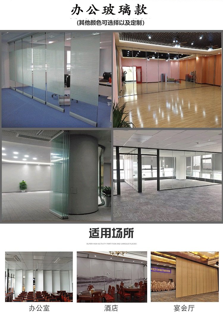 4、隔热、防火。活动隔断的隔热性能优良,在酒店、展厅中,可以根据不同入座率,把大空间分割成小空间,以降低空调电耗;活动隔断采用的是高效防火材料制作,防火性能良好。