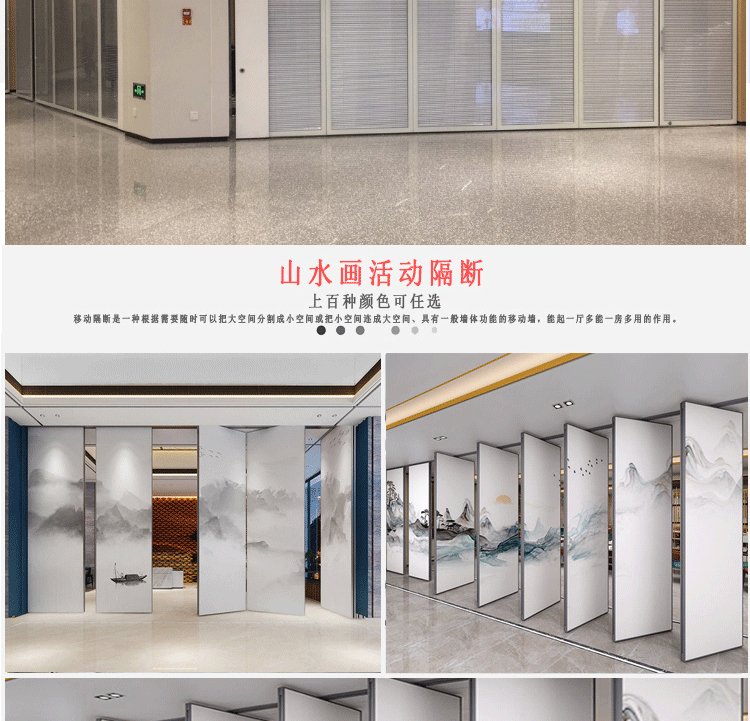 活动隔断具有高隔音、防火、可移动、操作简单等特点。极为适合星级酒店宴会厅、高档酒楼包间、高级写字楼会议室等场所进行空间间隔的使用。目前,活动隔断、固定隔断系列产品已经广泛适用在酒店、宾馆、多功能厅、会议室、宴会厅、写字楼、展厅、金融机构、政府办公楼、医院、工厂等多种场合。 活动隔断可以分为:拼装式活动隔断、推移式活动隔断、折叠式活动隔断、悬挂式活动隔断。活动隔断是一种根据需要随时把大空间分割成小空间或把小空间连成大空间、具有一般墙体功能的活动墙。活动隔断具有以下特点: 1.无地轨悬挂:地板无轨道,只需将轨道安装于天花板上; 2.稳定安全:隔断后稳固可靠,不易摆动; 3.隔音环保:隔音效果好,最大隔音系数可达53dB; 4.隔热节能:隔热性能优良,根据不同入座率,把大空间分割成小空间,以降低空调电耗; 5.高效防火:采用高效防火材料制作,防火性能良好; 6.美观大方:表面任意装饰,可与室内统一装饰效果; 7.收放灵活:隔板收放自如,推动灵活,一个人就可以完成隔断整个过程; 8.收藏方便:收板时,隔板可以隐藏在专用储柜中,不影响整体美观; 9.应用广泛:可应用于会议厅、展览厅、餐厅、高洁净工厂和办公室等场所
