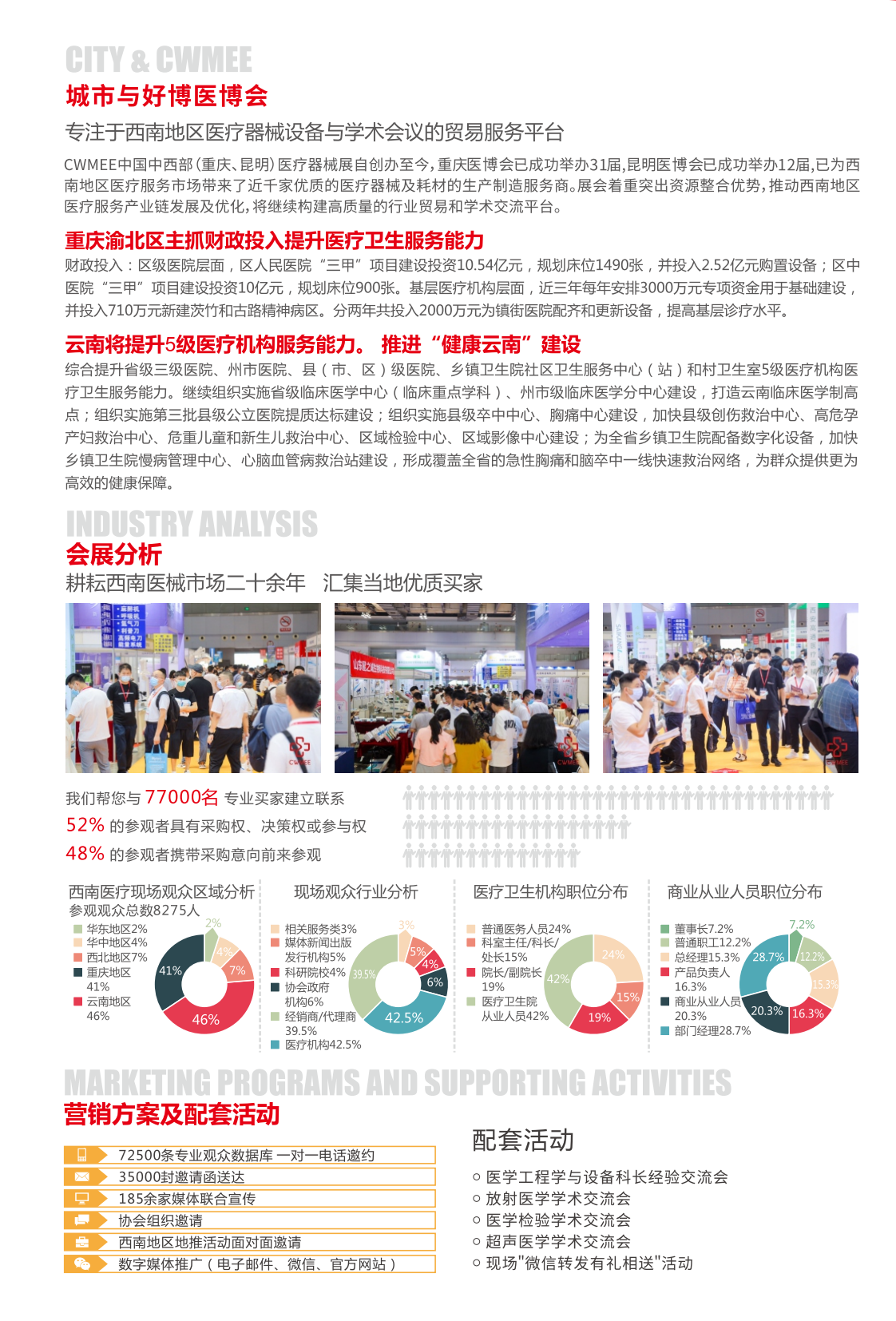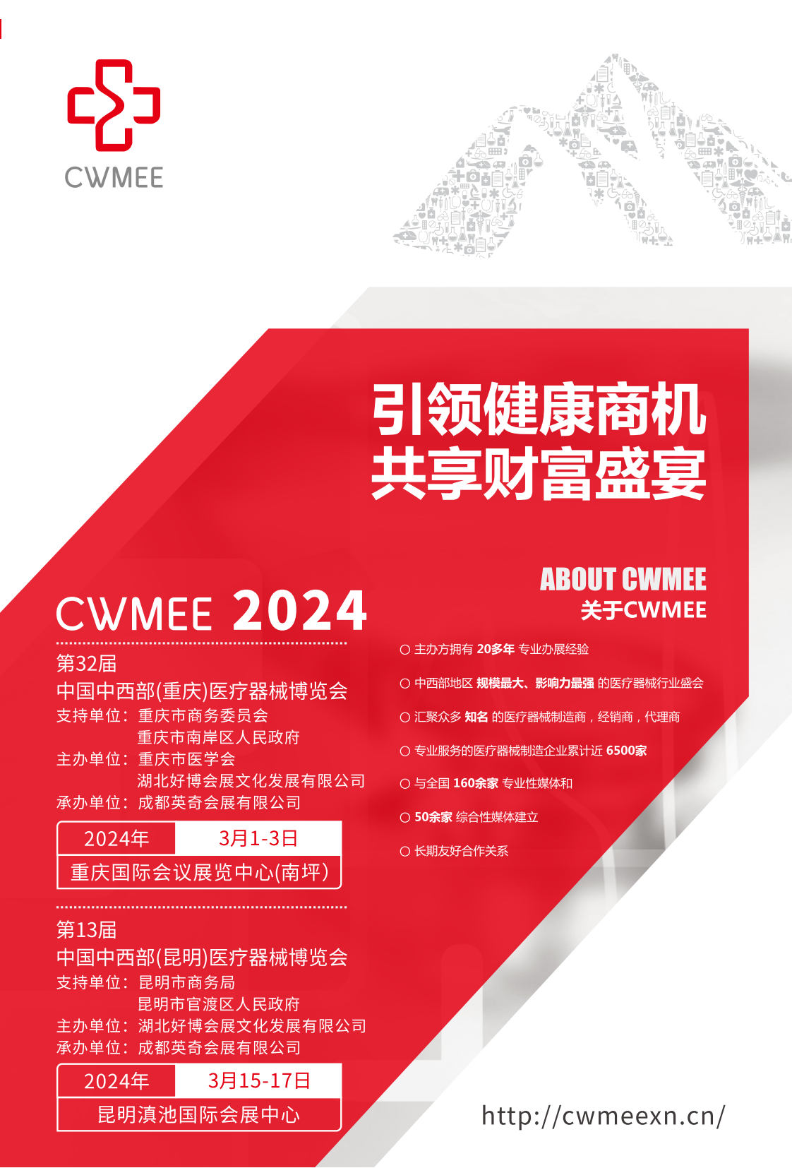 CWMEE中国中西部(重庆、昆明)医疗器械展自创办至今,重庆医博会已成功举办31届,昆明医博会已成功举办12届,已为西南地区医疗服务市场带来了近千家优质的医疗器械及耗材的生产制造服务商。展会着重突出资源整合优势,推动西南地区医疗服务产业链发展及优化,将继续构建高质量的行业贸易和学术交流平台。