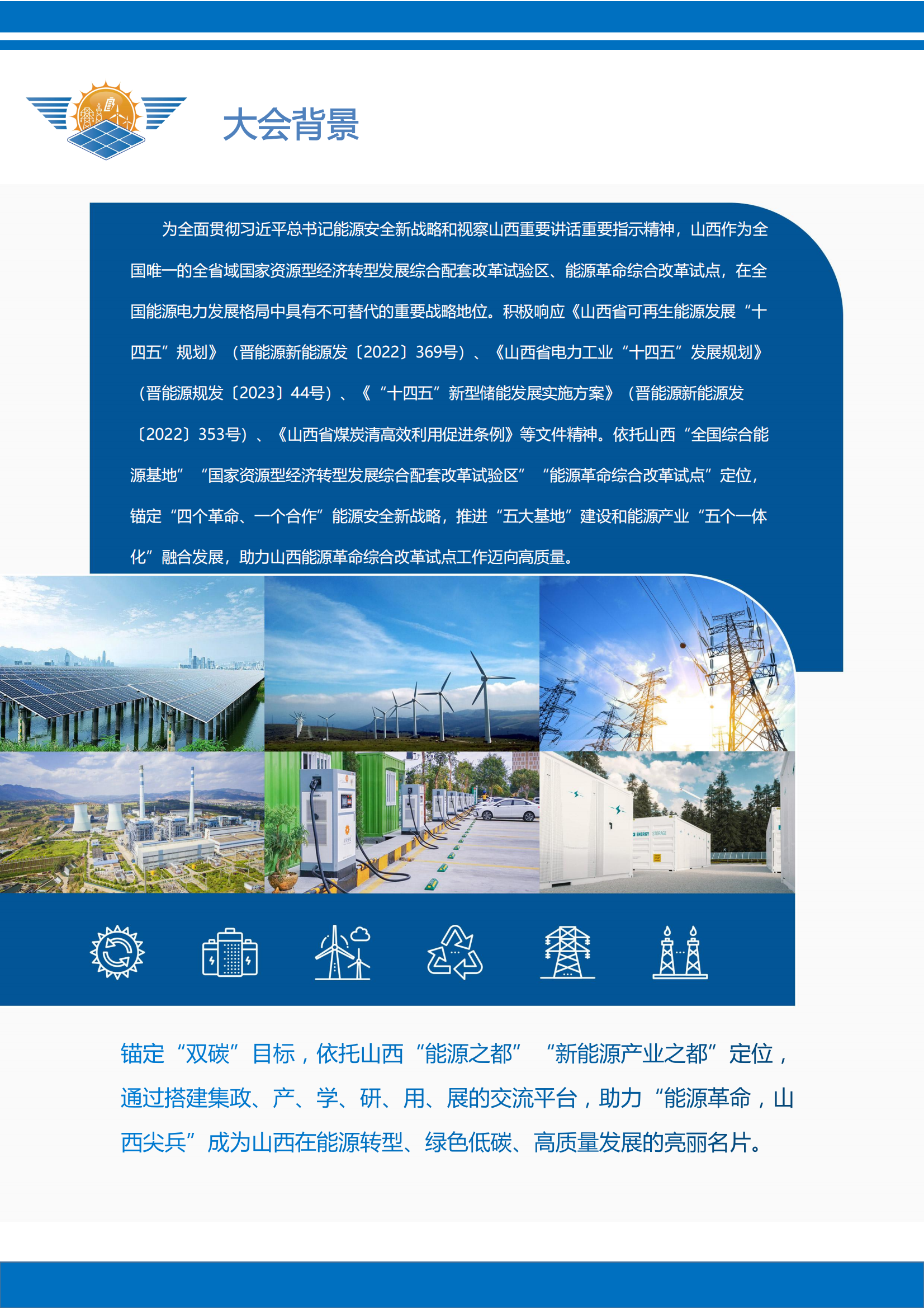图文详情为全面贯彻习近平总书记能源安全新战略和视察山西重要讲话重要指示精神,山西作为全国唯一的全省域国家资源型经济转型发展综合配套改革试验区、能源革命综合改革试点,在全国能源电力发展格局中具有不可替代的重要战略地位。积极响应《山西省可再生能源发展“+四五”规划》(晋能源新能源发[2022)369号)、《山西省电力工业“十四五”发展规划》(晋能源规[2023]44号)、《“十四五”新型储能发展实施方案》(晋能源新能源发[2022]353号)、《山西省煤炭清高效利用促进条例》等文件精神。依托山西“全国综合能源基地”“国家资源型经济转型发展综合配套改革试验区”“能源革命综合改革试点”定位,锚定“四个革命、一个合作”能源安全新战略,推进“五大基地”建设和能源产业“五个一体化”融合发展,助力山西能源革命综合改革试点工作迈向高质量。