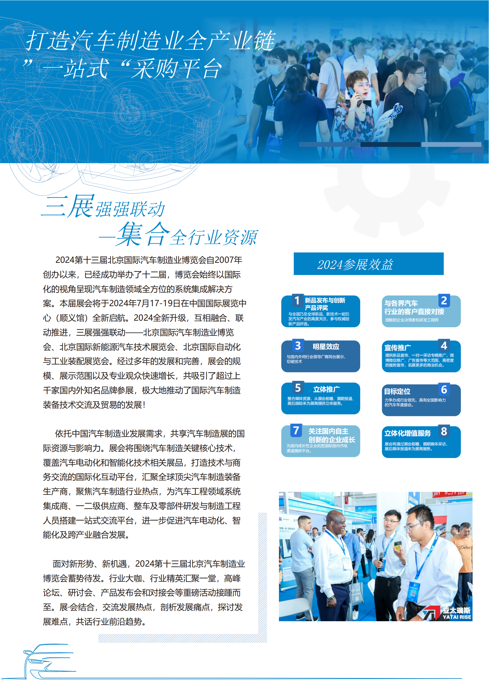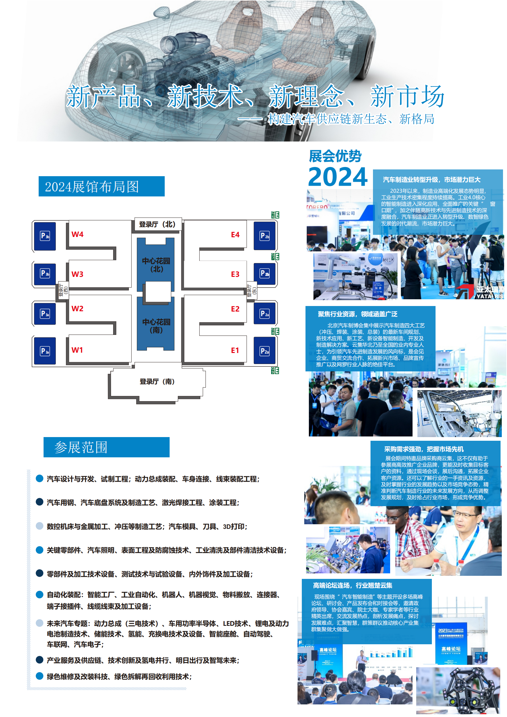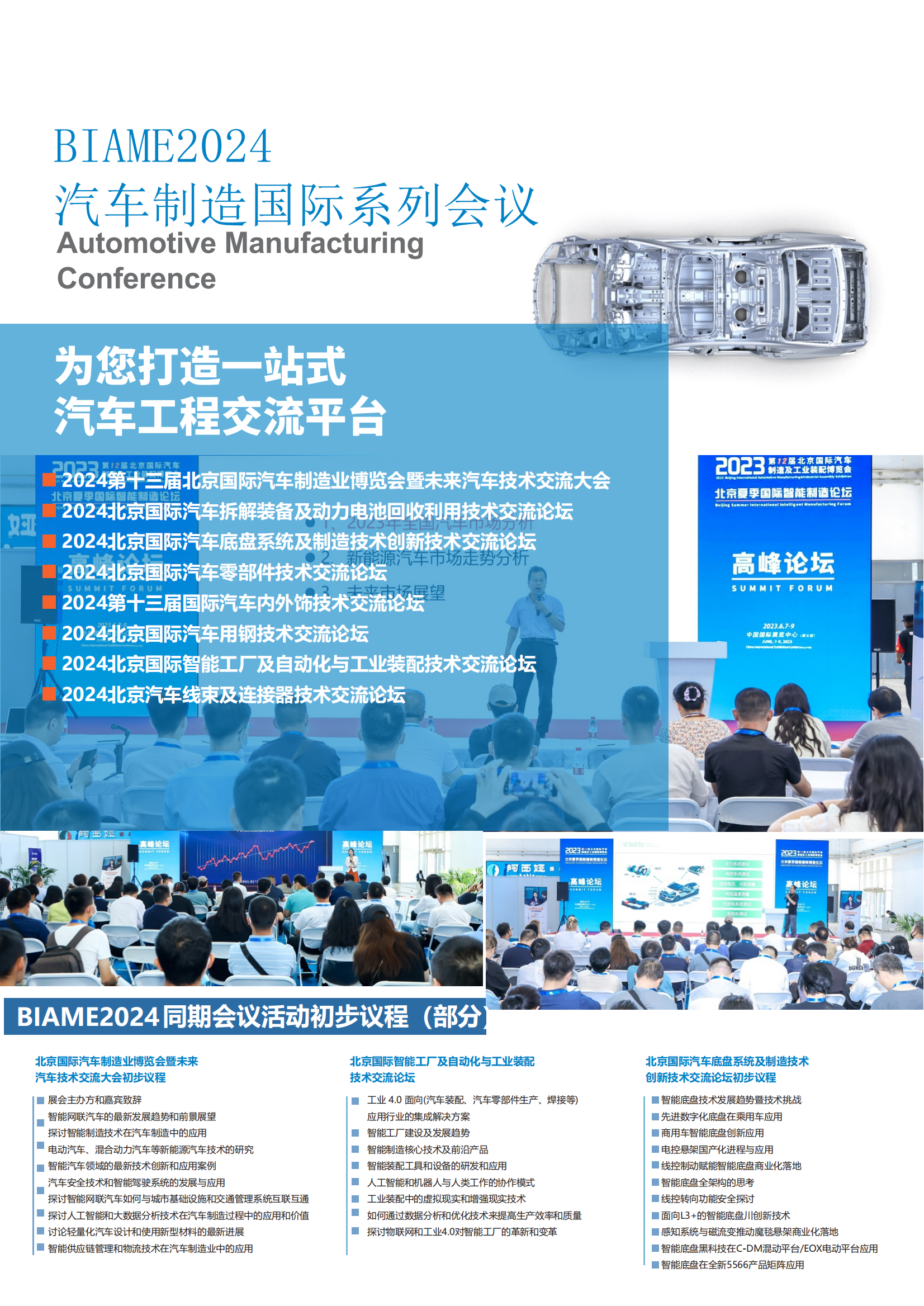 依托中国汽车制造业发展需求,共享汽车制造展的国际资源与影响力。展会将围绕汽车制造关键核心技术,覆盖汽车电动化和智能化技术相关展品,打造技术与商务交流的国际化互动平台,汇聚全球顶尖汽车制造装备生产商,聚焦汽车制造行业热点,为汽车工程领域系统集成商、一二级供应商、整车及零部件研发与制造工程人员搭建一站式交流平台,进一步促进汽车电动化、智车电动化、智能化及跨产业融合发展。面对新形势、新机遇,2024第十三届北京汽车制造业博览会蓄势待发。行业大咖、行业精英汇聚一堂,高峰论坛、研讨会、产品发布会和对接会等重磅活动接踵而