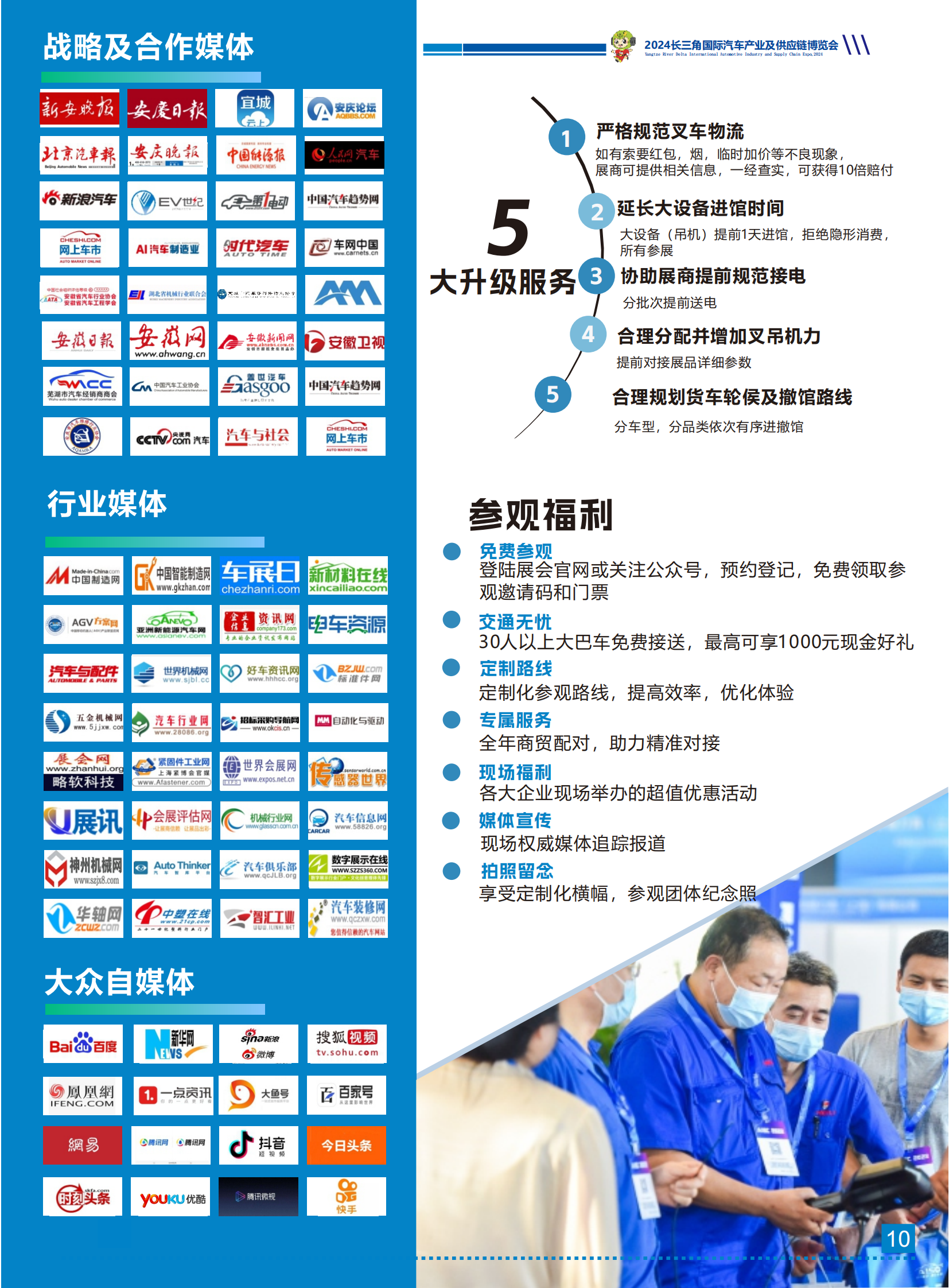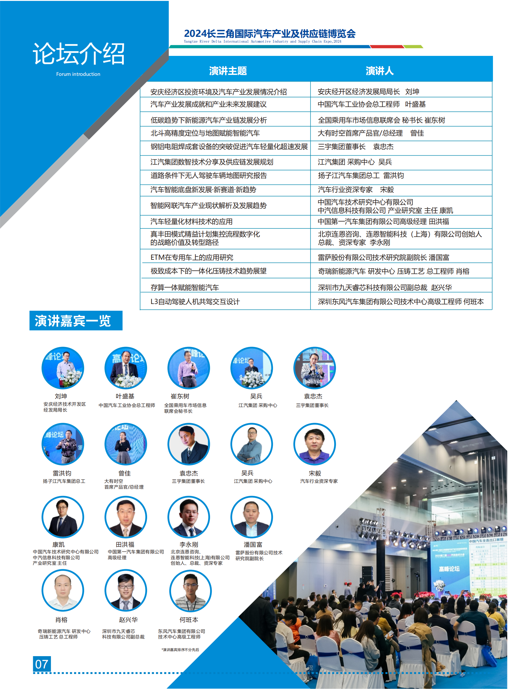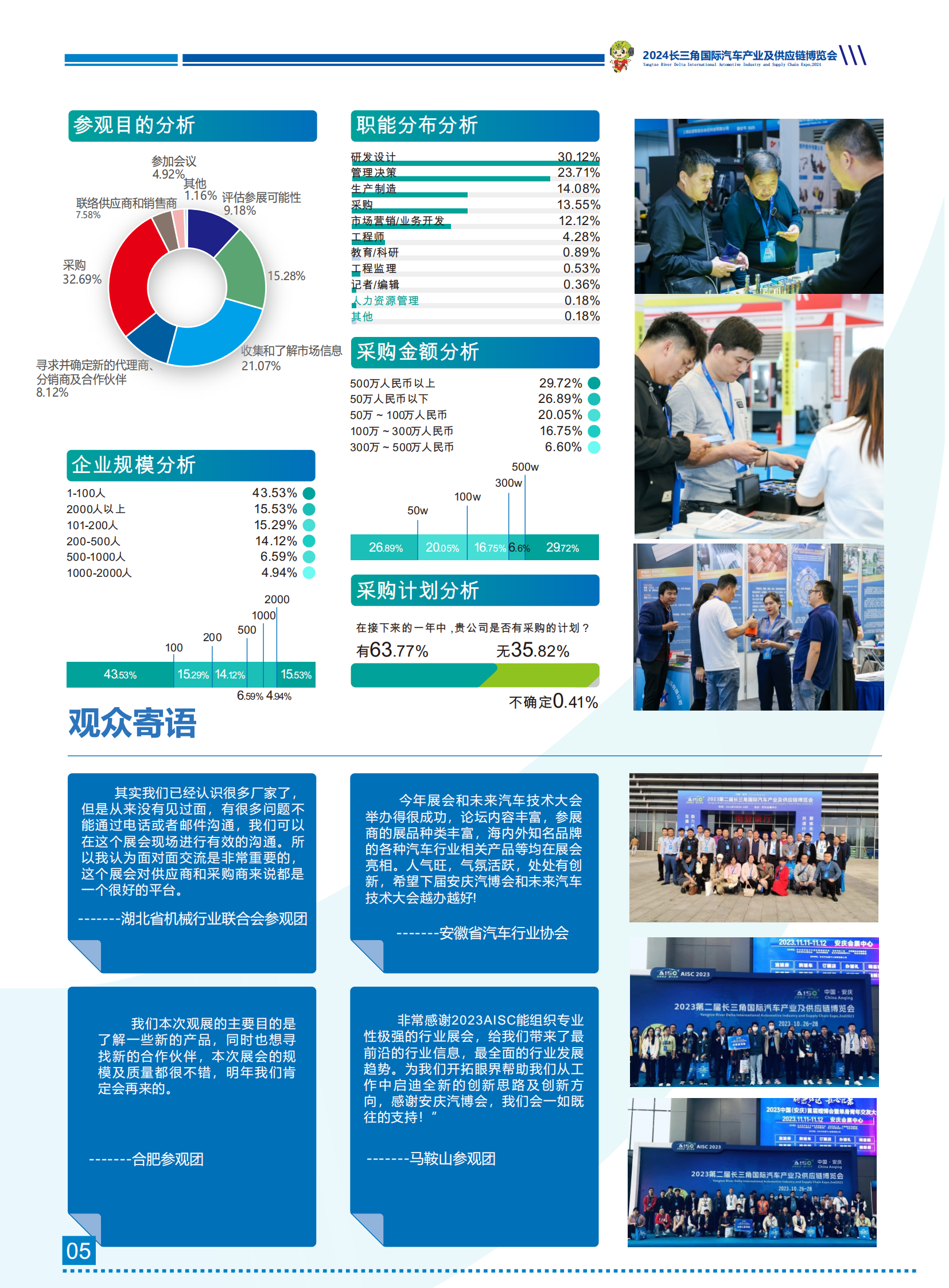 图文详情当前,全球新一轮科技和产业变革蓬勃发展,汽车与能源、交通、信息通信等领域有关技术加速融合,电 动化、网联化、智能化成为汽车产业的发展潮流和趋势。长三角一体化发展中,新能源汽车作为优势产业将迎 来发展新机遇,安徽省高度重视汽车产业发展,大力实施制造强省发展战略,把发展壮大汽车产业作为推动制 造业发展的重要抓手,提出将汽车及零部件产业打造成为万亿级产业的目标。在拥有振宜、江淮、福田雷萨三 大整车企业以及二百余家汽车产业链优势下,安庆充分发挥龙头企业“链主”带动作用,以局部带动整体,正逐 步推动汽车产业全环节全链条数字化转型。 长三角汽车产业及供应链博览会已经成功在安庆举办两届。依托安徽乃至长三角地区良好的产业优势,为 期三天的2023第二届长三角汽车产业博览会展出面积达25000㎡,350+知名企业参展,举办了20+场论坛活 动以及新供应链对接会,签约意向采购合同1.5亿元人民币。为业内人士提供了产品展示、技术交流、行业推广 及商贸对接的全方位机遇,已逐步成为我国长三角地区规模大、影响力强的高品质、综合性、专业化的品牌博 览会。 依托长三角庞大的市场需求和上海得天独厚的经济地位,2024年第三届长三角国际汽车产业及供应链博 览会继续肩负使命,将于2024年10月28-30日在安庆会展中心举办,以“创新驱动,智行未来”为主题,聚焦汽 车工程与装配技术、零部件机加工、制造装备、新能源汽车供应链等主题,汇聚国内外优秀企业和业界精英, 分享世界领先的前沿技术、创新应用和解决方案,推动参展参观企业跨越价值链上下游开展商务洽谈和合作对 接,扩大和加速新技术商业应用,全力拓展新商机,助力汽车产业发展提质增速。