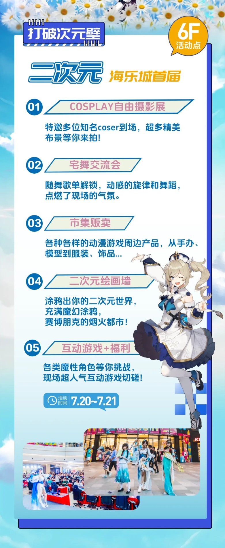 图文详情南京首届“漫游次元”动漫游戏嘉年华,宛如一场绚丽的梦境,将于7月20日至21日,在南京溧水海乐城6楼璀璨启幕。南京·首届漫游次元动漫游戏嘉年华将于2024年7月20-21日在南京海乐城举办,这场盛大的嘉年华将汇聚来自全国各地的动漫游戏爱好者,共同见证一场视觉与心灵的盛宴。在为期两天的活动中,将有多场精彩的演出、比赛和互动环节,让每一位参与者都能找到自己的乐趣所在。